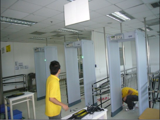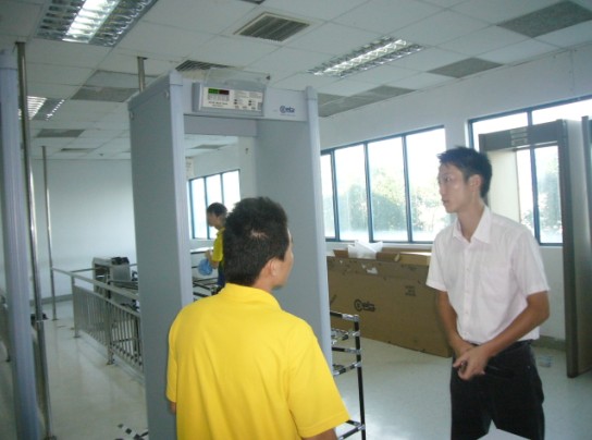 為了確保我們的安檢任務不出一點差錯。思邁奧公司的銷售人員曾小姐還主動提出在合同簽訂之前可以先把產品拿到我們的安檢現場去親自測試。7月28日,思邁奧公司2名技術員帶上了HI-PE的安檢門產品前往我公司做了現場安裝測試,真是顯示出了啟亞安檢門的獨特優勢。一點都不受干擾。而且我們還發現了一個奇怪的現象:當我們把我們的數碼相機產品放到安檢門的外門板處時,安檢門會發出滴滴滴的報警聲,5秒鐘過后安檢門開始停止報警,也就是說這時候HI-PE型號的安檢門開始啟動了一個干擾源排除的特殊功能。而當我們把數碼相機移走后安檢門又開始報警重新搜索新的檢測程序,5秒鐘后又可以正常檢測了。這與我們上海工廠使用的那臺芬蘭生產的METOR200型的進口金屬探測門也有著本質的區別呢。